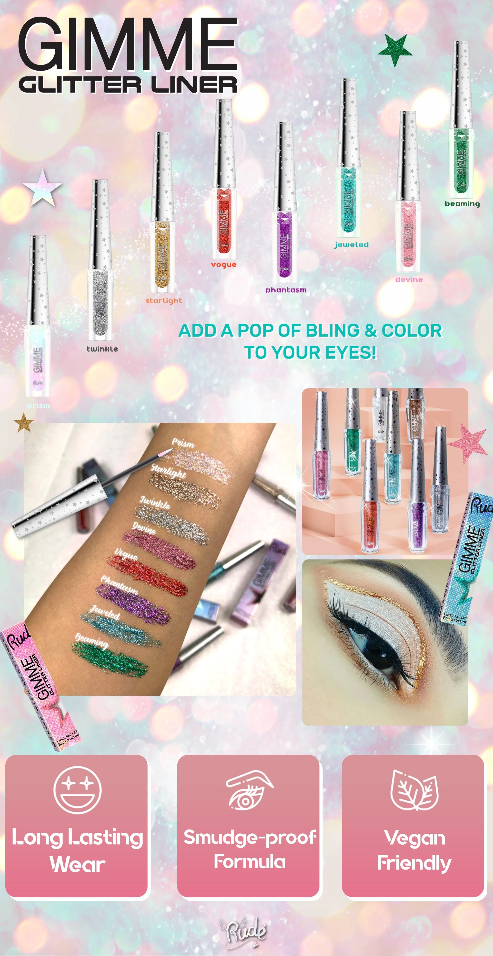 Ajlajner sa šljokicama Gimme Glitter za sjaj i boju na Vašim očima. Za glamurozan make up, da Vam oči zasijaju poput zvezda. Šminkanje bez nereda rasutih šljokica. Ajlajner se brzo suši i ne razmazuje se. Proizvod je dostupan u 8 nijansi – roze, crvena, mint, ljubičasta, zelena, srebrna, plavo zelena i u boji starog zlata. U osnovi, ajlajner je kremast poluprovidan gel, a šljokice se presijavaju pod određenim uglovima i prelivaju se u različitim bojama koje se međusobno slažu. Dugotrajna formula ajlajnera će ostati tokom celog dana.