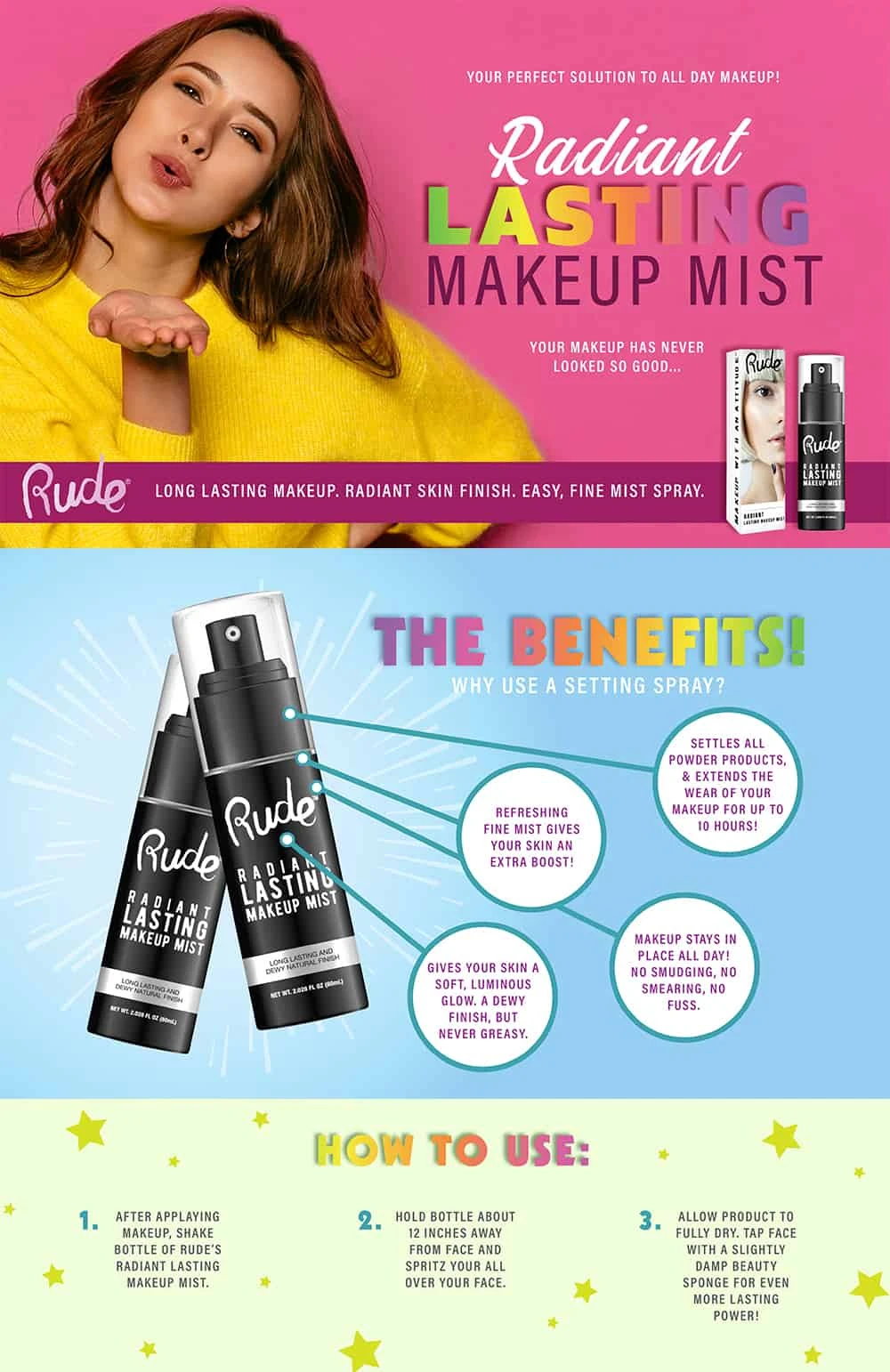 Fiksator šminke u spreju je mist za lice koji se koristi kao završni korak u kreiranju make up a koji će biti postojan tokom celog dana. Koži daje lep i zdrav sjaj uz pomoć finih čestica za iluminaciju tena koji i produžava postojanost šminke i do 10 sati. Ne dozvoljava da se šminka razmaže .