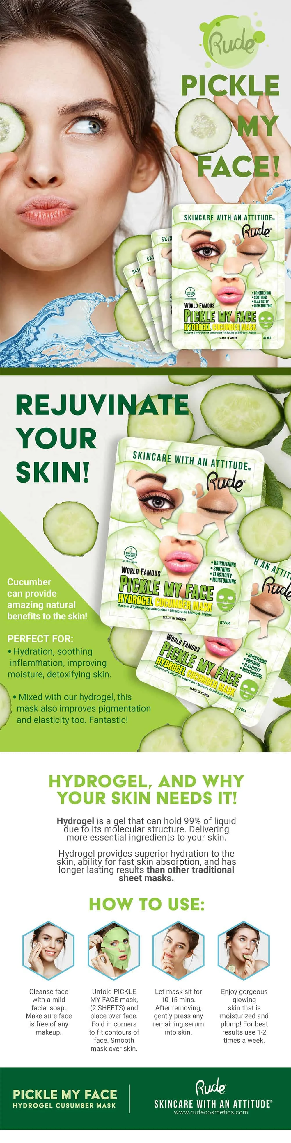 Maska za lice u vidu gela sastavljena je od prirodnih ekstrata krastavca. Pogodna je za pripremu lica pre nanošenja šminke. Pomaže hidrataciju kože i ima dugotrajni rezultat. Maska će pružiti izvrsno obnavljanje kože lica. Aktivni hidratantni sastojci deluju iznutra, jačaju kožnu barijeru čineći kožu lica mekom, sjajnom, glatkom i odmornom.