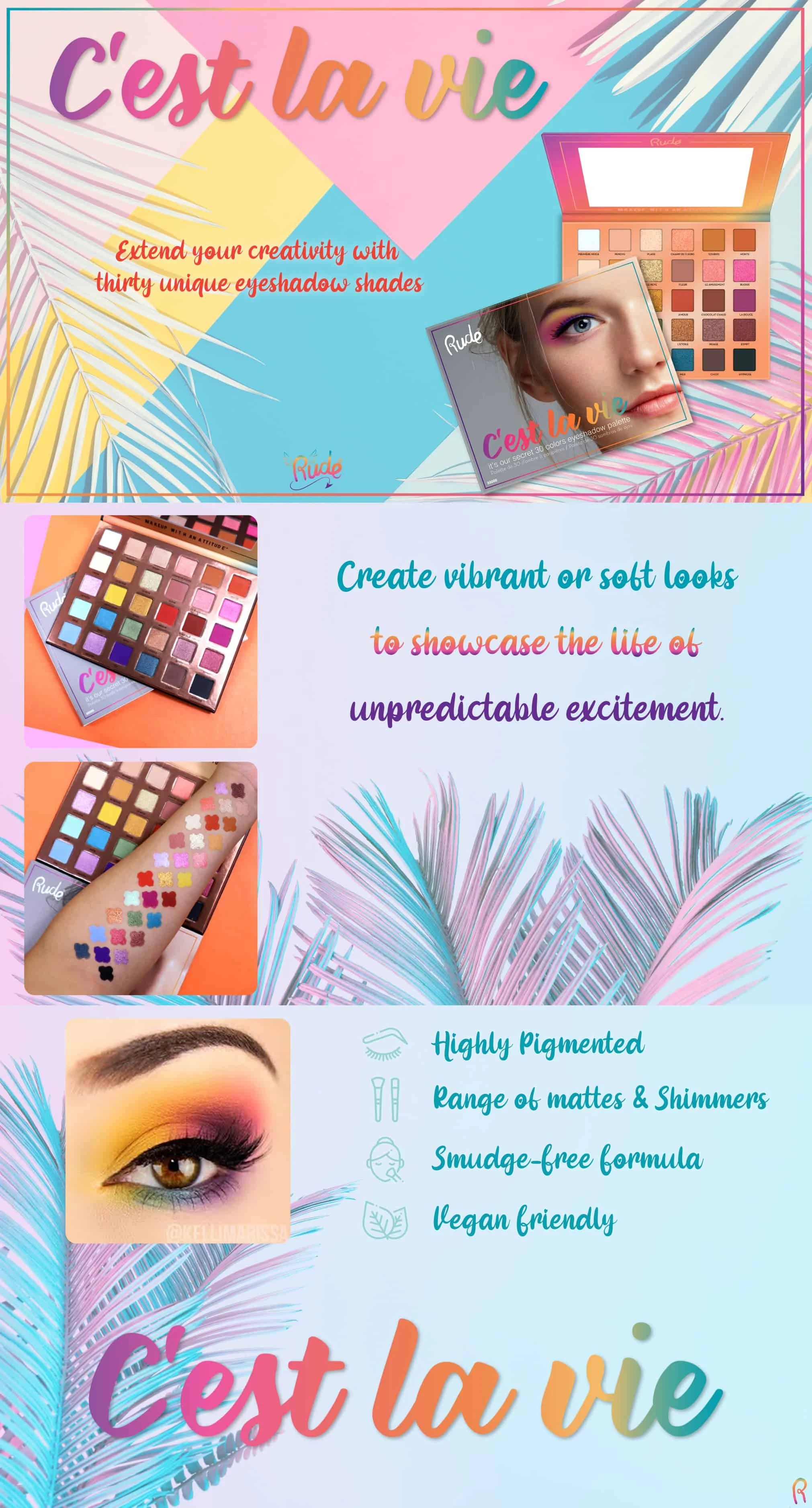 Paleta senki za oči C'est La Vie sadrži od svetlijih do tamnijih nijansi, koje će zadovoljiti Vaše potrebe za dnevnom i večernjom šminkom. Proširite Vašu kreativnost za kreiranje savršenog make up-a sa trideset nijansi senki. Paleta za šminkanje neophodna svakome od nas. Stvorite živahan ili nežan izgled da prikažete život nepredvidivog uzbuđenja. Sjane nijanse sa diskretnim sitnim šljokicama ili potpuno mat tonovi!