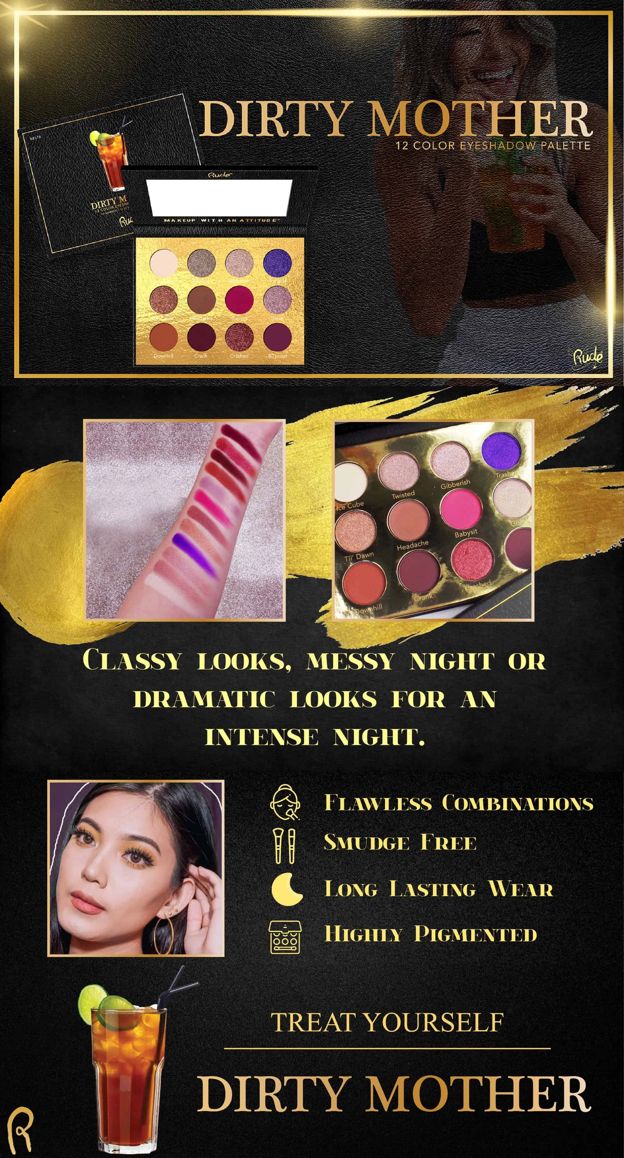 Paleta senki za oči Dirty Mother je iz linije Coctail Party proizvoda. Klasičan, neobavezan ili dramatičan make up za intezivnu noć. Šminkanje sa izborom od 12 boja u paleti biće zabavan zadatak.Šminka na očima govoriće umesto Vas, reči će biti suvišne, i to je u redu jer vas ležerni izgled neće izneveriti.