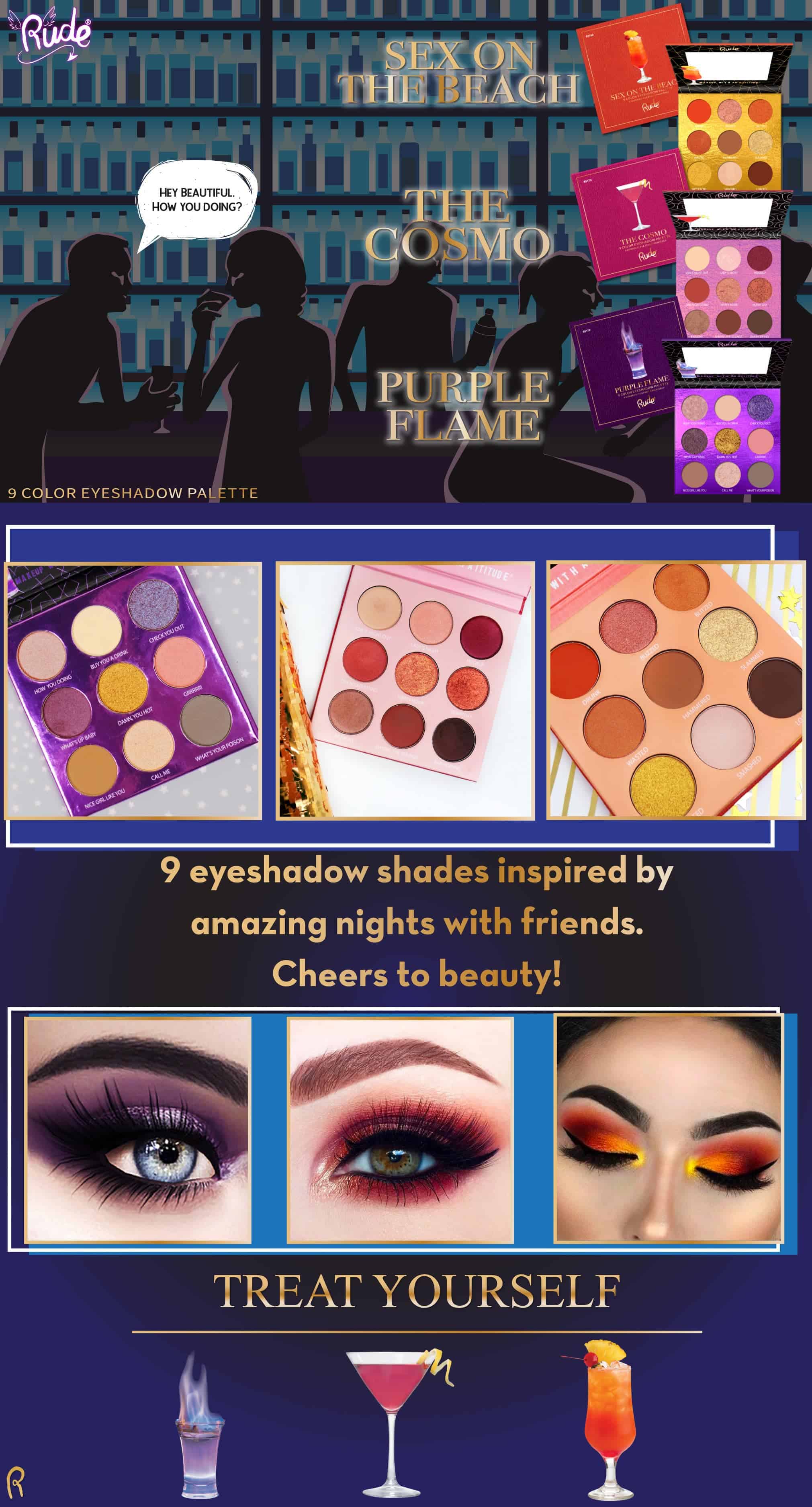 Paleta senki za oči Sex on the beach je iz linije Coctail Party proizvoda. Zanosan make up za dinamičnu noć. Devet nijansi senki za izgled od nežnog do seksipilnog. Uz pomoć 4 mat i 5 šljokičastih boja primamićete mnoge poglede. Paleta je inspirisana je neverovatnim noćima provednih u pijuckanju koktela sa prijateljima! Nazdravimo lepoti očiju!