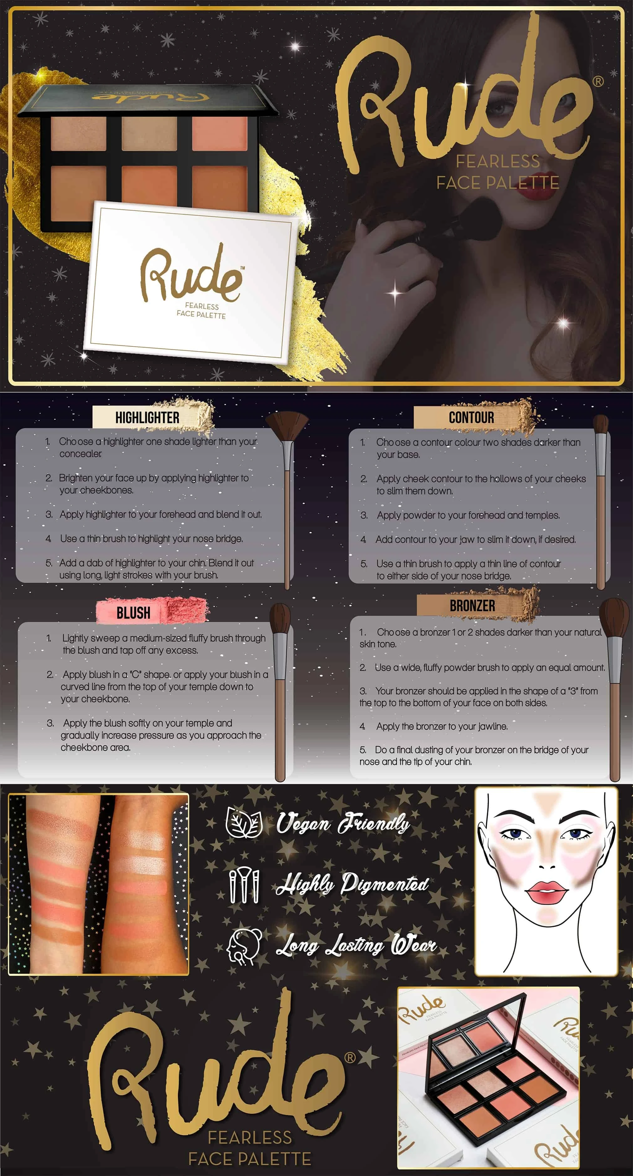 Istaknite svoje najbolje lice i iskoristite dan sa paletom za lice Fearless. Ova paleta uključuje 6 nijansi idelanih za hajlajtovanje i definisanje ključnih područja i dodavanje boje na obraze. Nijanse boja iz palete čine da naglasite željene delove lica, za perfektan izgled tena. Hladni i topli tonovi koji se odlično kombinuju i blenduju i odgovoraju svim tonovima kože.