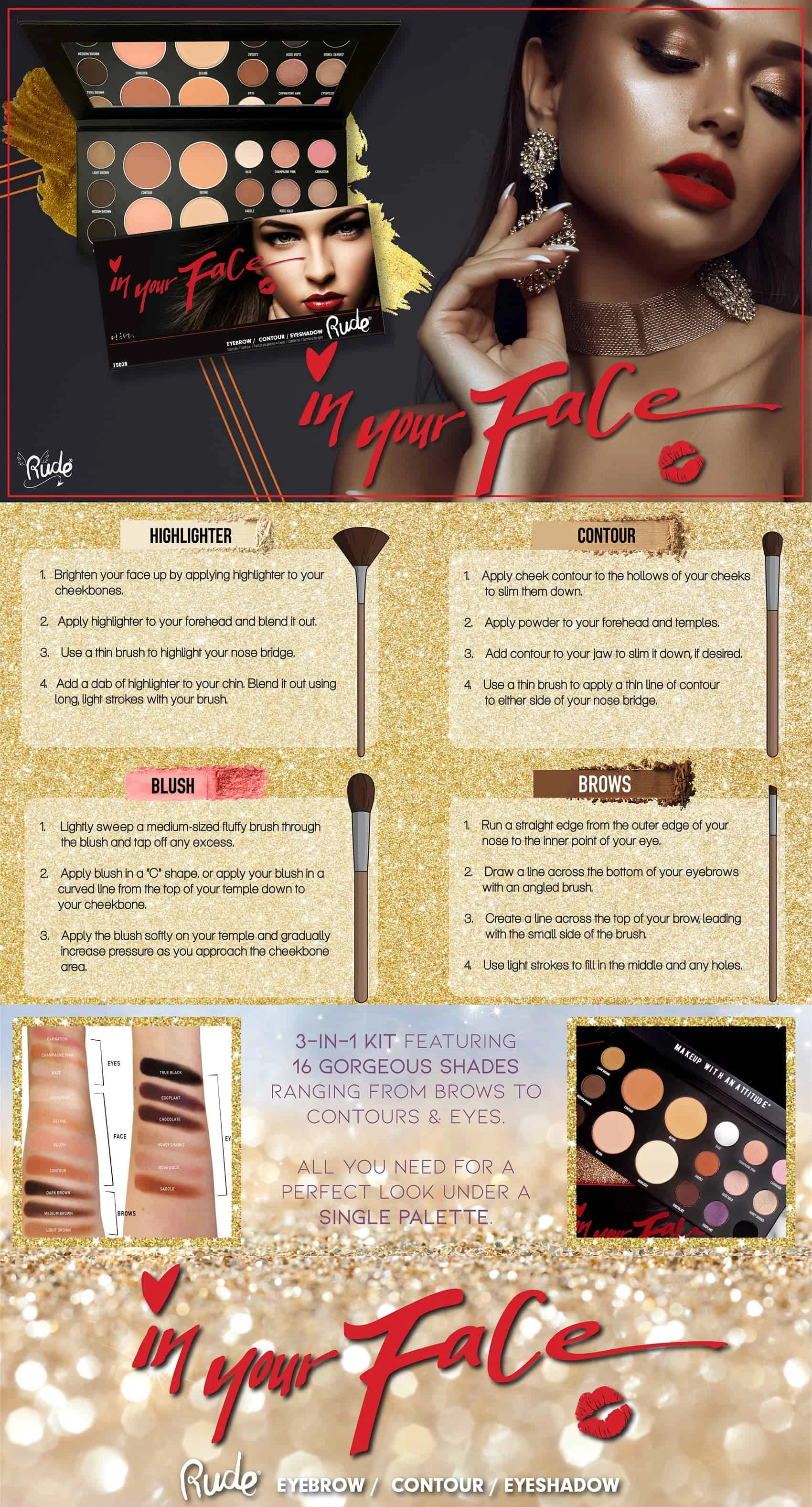 Paleta za šminkanje 3 u 1 - In Your Face je kombinovana paleta za šminkanje lica, očiju i obrva. Sve što Vam treba za savršen izgled sa samo jednom paletom. 16 prelepih nijansi za lice, obrve i oči.