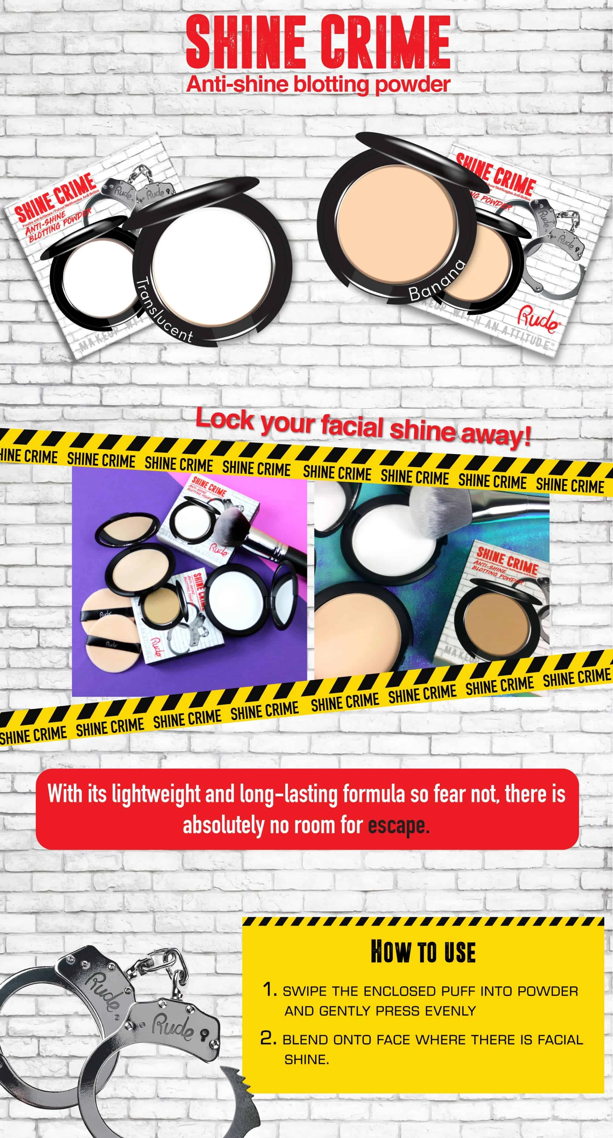 Puder za matiranje kože Shine Crime Anti-Shine Blotting Powder je tu za Vas da zaključa sjaj Vašeg lica sa svojom laganom i dugotrajnom formulom.