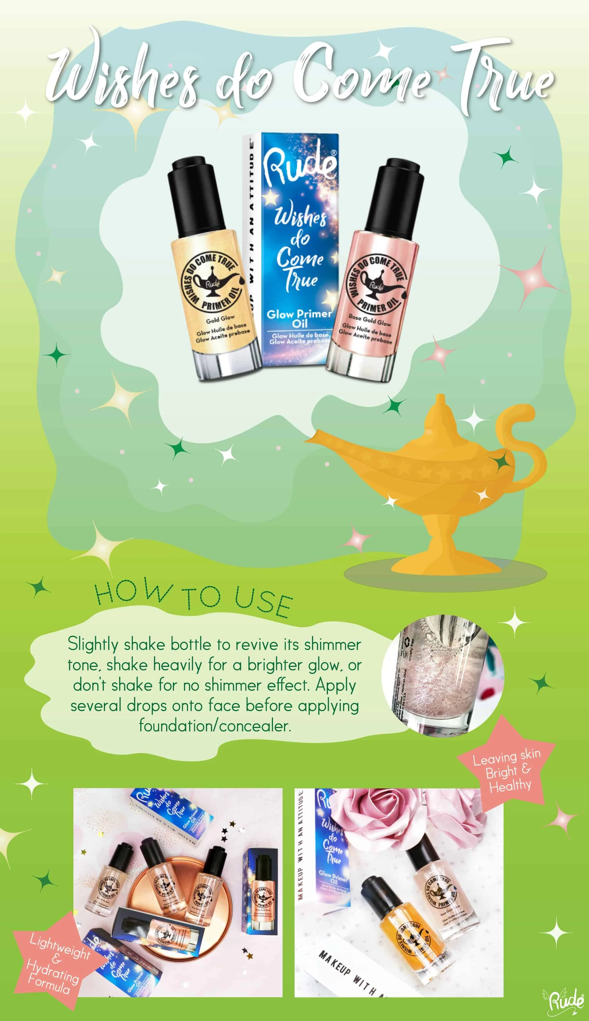Revulucionarni uljani prajmer za lice je tu da pripremite Vaše lice za perfektni make up. Pre šminkanja ukloniće sve nesavršenosti i linije na licu. Lagana i hidratantna formula sa umirujućim mirisom će ostaviti Vašu kožu svetlom i zdravom. Promućkajte malo da oživite zlatan ton ruže ili malo jače za jači sjaj. Ne stvara osećaj težine na koži lica. Prajmer se nalazi u pakovanju sa pipetom i olakšava nanošenje istog.